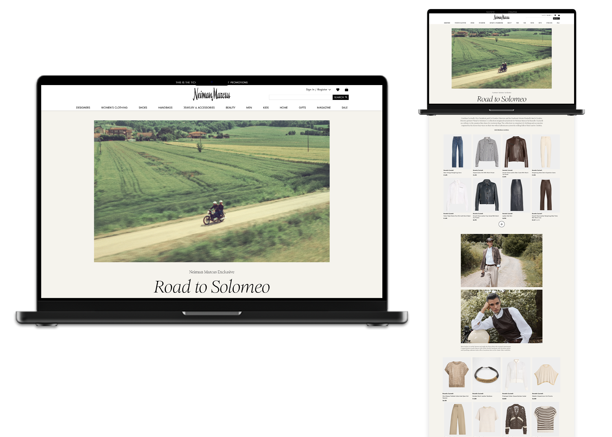 The Road to Solomeo digital lookbook, created for Neiman Marcus, showcases an exclusive capsule collection by Brunello Cucinelli that pays homage to the brand's Umbrian heritage and the founders' passion for motorcycling. The collection features over 50 styles of men's and women's ready-to-wear and accessories, inspired by the attire worn during two-wheel adventures across the rolling hills of Umbria. The lookbook's design emphasizes earthy tones and luxurious textures, reflecting the collection's fusion of classic motorcycling heritage with modern elegance.